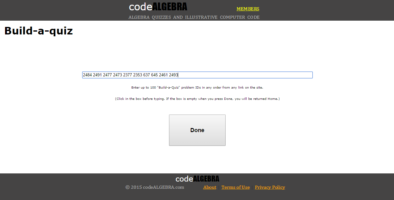 5. Once you have all your problem IDs, click the green BUILD-A-QUIZ tab to bring up Screen #1. Then enter (type) your problem ID numbers into the box.
