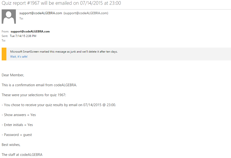 11. Once the quiz is over (the email time has passed), you will automatically receive your quiz results by email. There is only one emailed report per quiz.