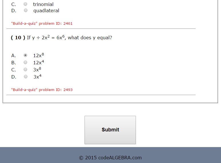 - Show answers when done? 'Yes' if you want the correct answer to be given after the Submit button is pressed.