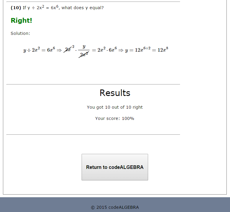 5. Screen #4 shows the bottom of the answer page. When done reviewing the answers, click Return to codeALGEBRA. You will be returned Home.